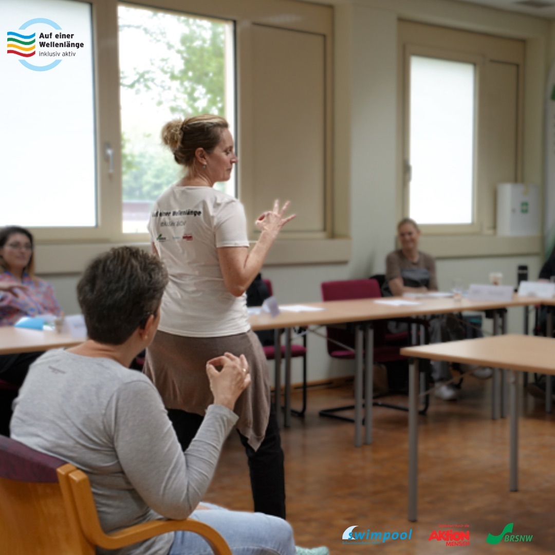Über die Historie der Deutschen Gebärdensprache wurde über Hörgeräte-Attrappen und Tonaudiogramme aufgeklärt, die Wichtigkeit von Mimik und Gestik hervorgehoben und anschließend Vokabeln – spezifisch mit Schwimmen als Oberthema – gepaukt. Auch Gebärdensprachnamen wurden diskutiert. Am Ende der zweitägigen Fortbildung konnten alle selbst eine eigene kleine Stunde anleiten in Gebärdensprache – denn schon im Vorfeld hatten alle das Finger-Alphabet bekommen und konnten dadurch vor Ort bereits ihren Namen buchstabieren. ✌🏽