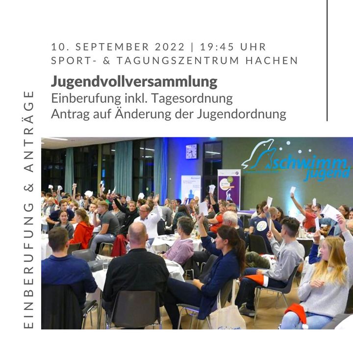 Wir laden zur Jugendvollversammlung am 🗓 10. September 2022 um 19:45 Uhr ins Sport- und Tagungszentrum Hachen ein. Die Ausgabe der Stimmkarten erfolgt von 18:00-19:30 Uhr. Jede*r Delegierte kann nur einen Verein repräsentieren 🗳 und muss die unterschriebene Vollmacht des Schwimmvereins bei der Stimmkartenausgabe vorlegen.