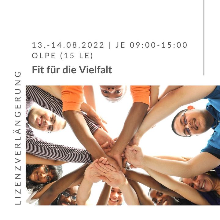 Vom 13.-14.08. findet das Intensivseminar „Fit für die Vielfalt“ 👍🏾👍🏼👍🏿 in Olpe statt, dass für die Verlängerung zahlreicher Zertifikate & Lizenzen anerkannt wird.