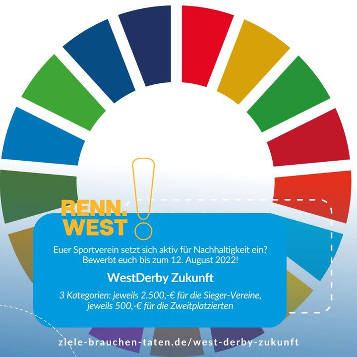 Bis zum 🗓 12. August 2022 könnt ihr euch für das WestDerby Zukunft von @renn.west bewerben! Dieser Wettbewerb richtet sich explizit an Sportvereine, die sich aktiv für Nachhaltigkeit ♻️ einsetzen. Zu Gewinnen gibt es pro Kategorie bis zu 💰 2.500,-€.
