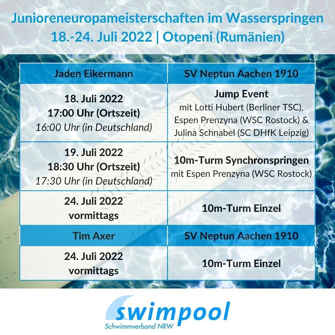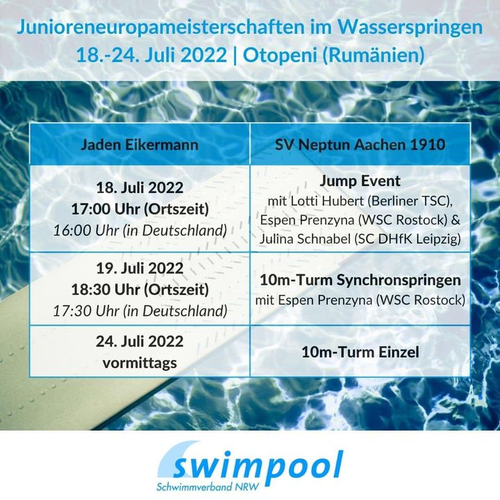 Heute geht es los mit den Europameisterschaften der Junior*innen im Wasserspringen. Mit dabei im rumänischen Otopeni 🇷🇴 ist Jaden Eikermann vom SV Neptun Aachen