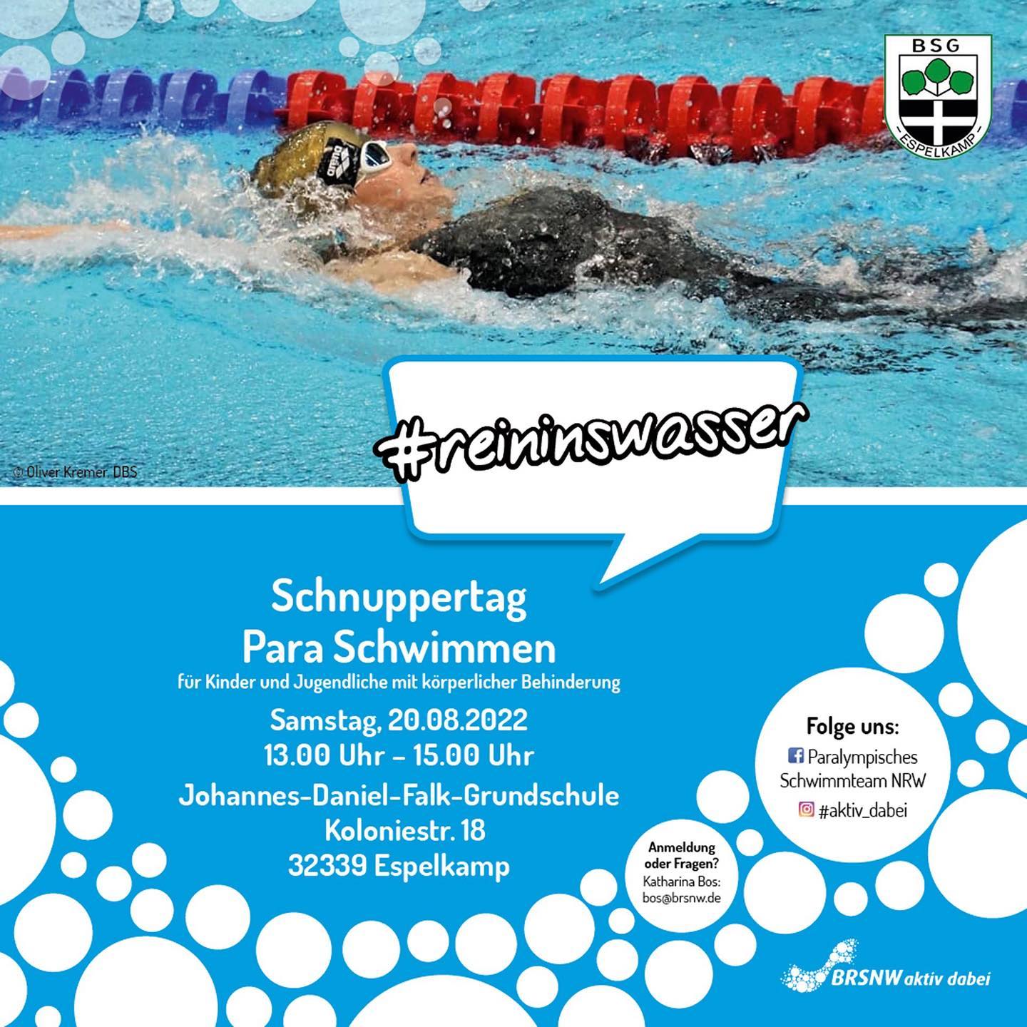 Am 🗓 20.08.2022 findet wieder ein Para-Schnuppertag im Schwimmen 🏊🏽 vom Behinderten- & Rehabilitationssportverband NRW @aktiv_dabei statt. Anmelden könnt ihr euch direkt per Mail bei Katharina Bos 📧 bos@brsnw.de