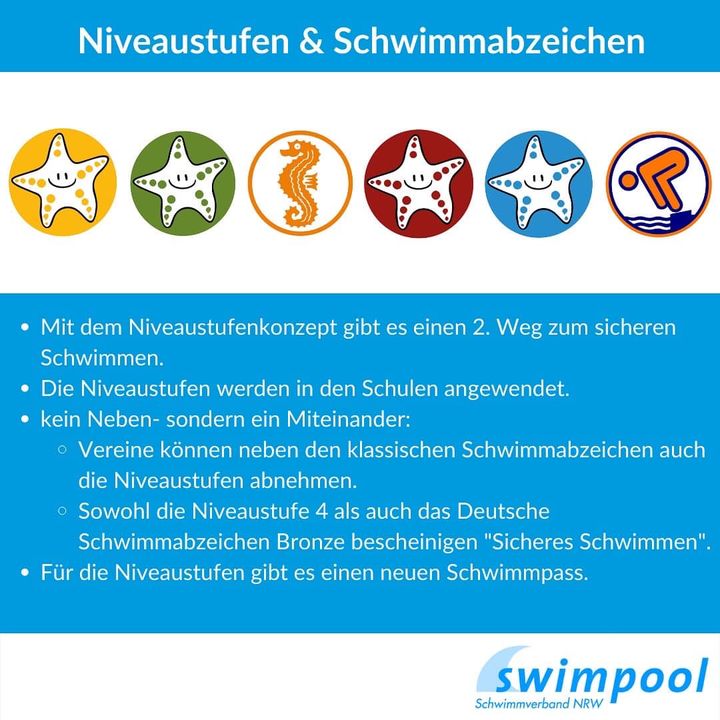 Mit dem Niveaustufenkonzept gibt es einen 2. Weg zum Sicheren Schwimmen. ️️ Für die Niveaustufen gibt es einen neuen Schwimmpass, den ihr beim Schwimmverband NRW bestellen könnt.