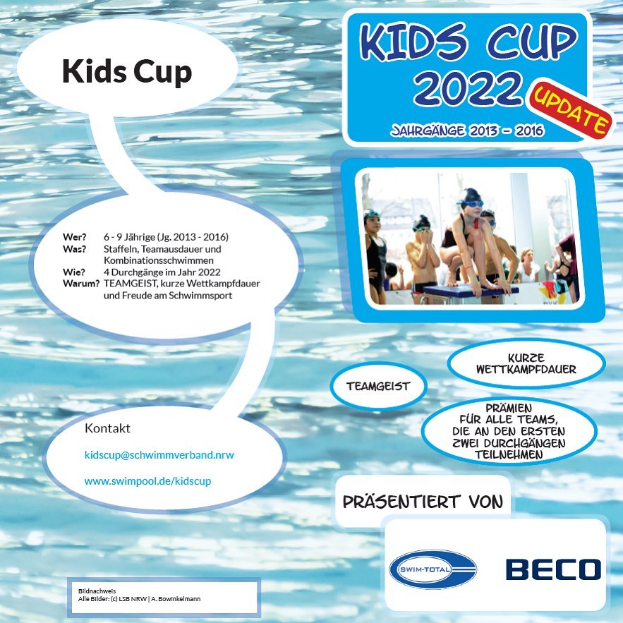 Der KidsCup ist für die junge Schwimmer*innen 🏊🏾♀️🏊🏼♂️ von 6 bis 9 Jahren (Jahrgänge 2013 - 2016). Geschwommen werden Staffeln, Ausdauerstrecken im Team, sowie Kombinationsübungen. Die Vorteile des KidsCups sind die kurze Wettkampfdauer ⏰ , der Förderung des Teamgeistes 🥳 und die Freude am Schwimmsport.