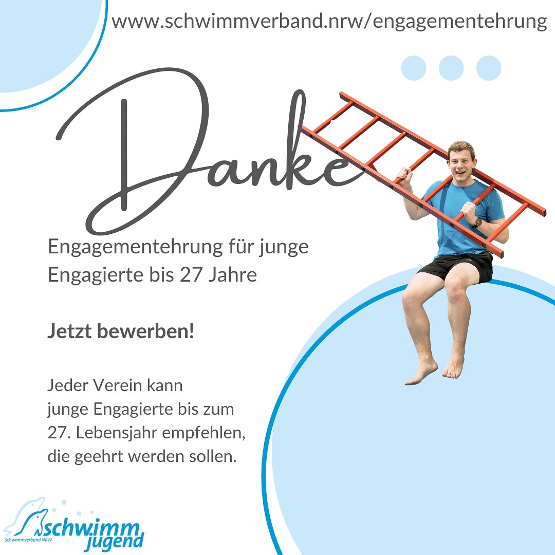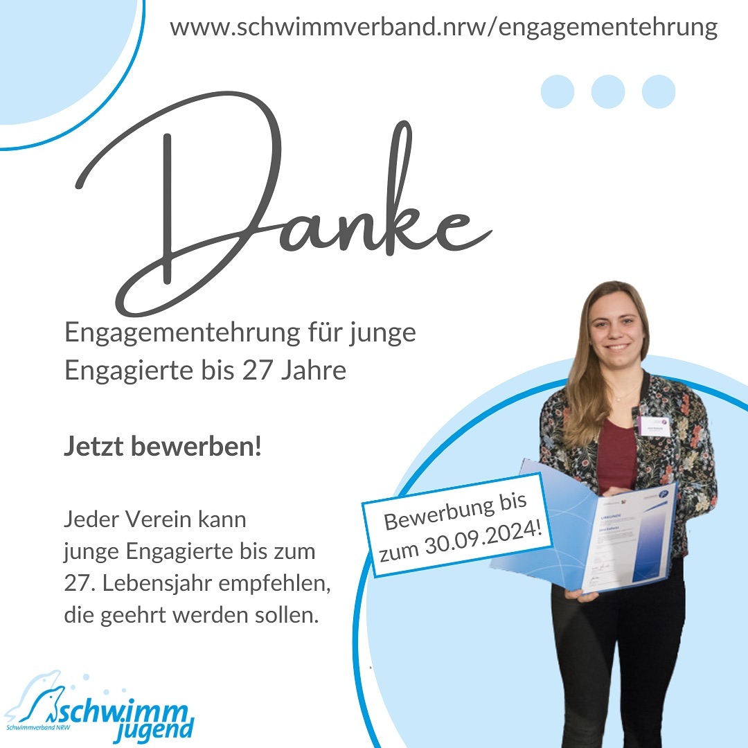 Das besondere Engagement der jungen Engagierten in den Schwimmsportvereinen in NRW möchte die Schwimmjugend NRW auszeichnen und ruft die Vereine auf, ihre jungen Engagierten zur Engagementehrung vorzuschlagen. Jeder Verein kann junge Engagierte bis zum 27. Lebensjahr empfehlen, die geehrt werden sollen. 🤩