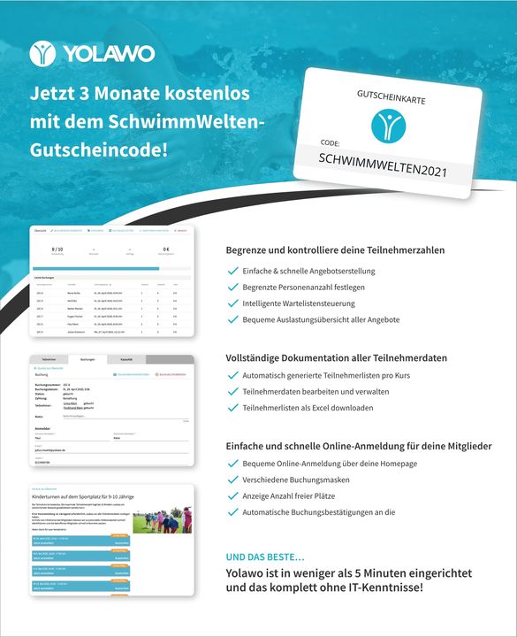 Ist für euch die Verwaltung eurer Schwimmgruppen zeitaufwendig? Würdet ihr gerne euren Anmeldeprozess modernisieren? Dann könnte unser neuer Kooperationspartner Yolawo genau das Richtige für euch sein. Alle Infos zu euren Vorteilen als Mitgliedsverein findet ihr auf unserer Homepage
