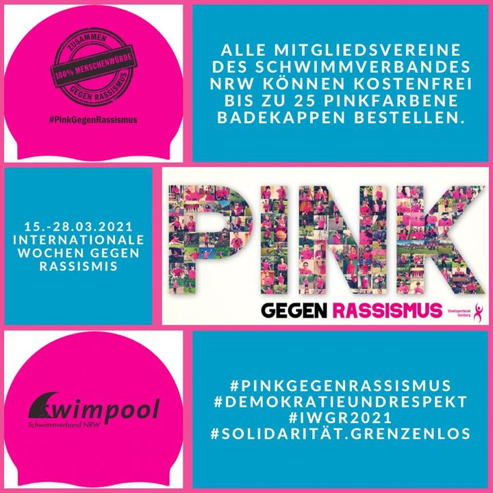 Vom 🗓 15.-28.03.2021 finden die Internationalen Wochen gegen Rassismus von der @stiftunggegenrassismus statt. Im Rahmen dessen beteiligt sich der Schwimmverband NRW an der Aktion #PinkGegenRassismus 💕 im Sport in NRW.