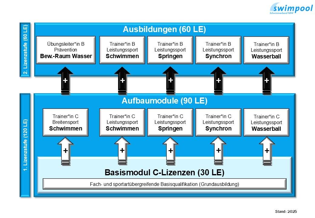 In der Regel beginnen Lizenzausbildungen mit einer Vorstufenqualifikation, die als Basismodul (auch Grundausbildung oder Basisqualifikation) bezeichnet wird. Nach dem Basismodul folgt in Form eines Aufbaumoduls die Spezialisierung zum Abschluss der 1. Lizenzstufe (Trainer*in C). Darauf aufbauend folgt die 2. Lizenzstufe (Trainer*in B), die dazu dient, das vorhandene Wissen aus der bereits gewählten Profilierung der Trainer*in C-Lizenz noch weiter zu vertiefen. Die 3. Lizenzstufe (Trainer*in A-Lizenz) kann nach dem erfolgreichen Abschluss der Trainer*in B-Lizenz ausschließlich über den zuständigen Bundesverband (Deutscher Schwimm-Verband) absolviert werden und wird nicht von uns durchgeführt.