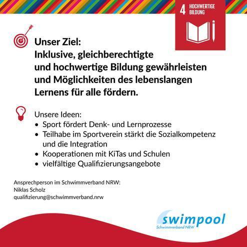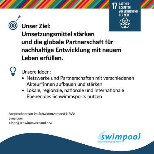 Lasst uns gemeinsam starke Partnerschaften und starke Netzwerke aufbauen, um mit unterschiedlichsten Akteur*innen den Nachhaltigkeitszielen ein wenig näher zu kommen. Ihr seid daran interessiert, als Schwimmverein oder -abteilung nachhaltiger zu werden? Dann wäre hier der Vorschlag für den Aufbau eures eigenen Netzwerkes: Svea Loer ist unsere Expertin im Bereich Nachhaltigkeit im (Schwimm-) Sport und Mitglied in unserem Jugendausschuss: s.loer@schwimmverband.nrw