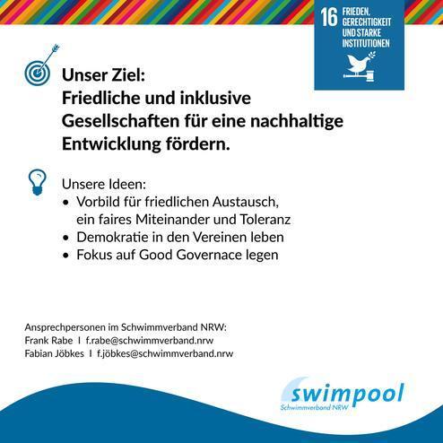 Was hat denn unser Sportverein mit "Frieden, Gerechtigkeit und starken Institutionen" zu tun? Eine ganze Menge! Das 16. der UN-Nachhaltigkeitsziele wird in den Schwimmvereinen und -abteilungen tagtäglich gelebt!